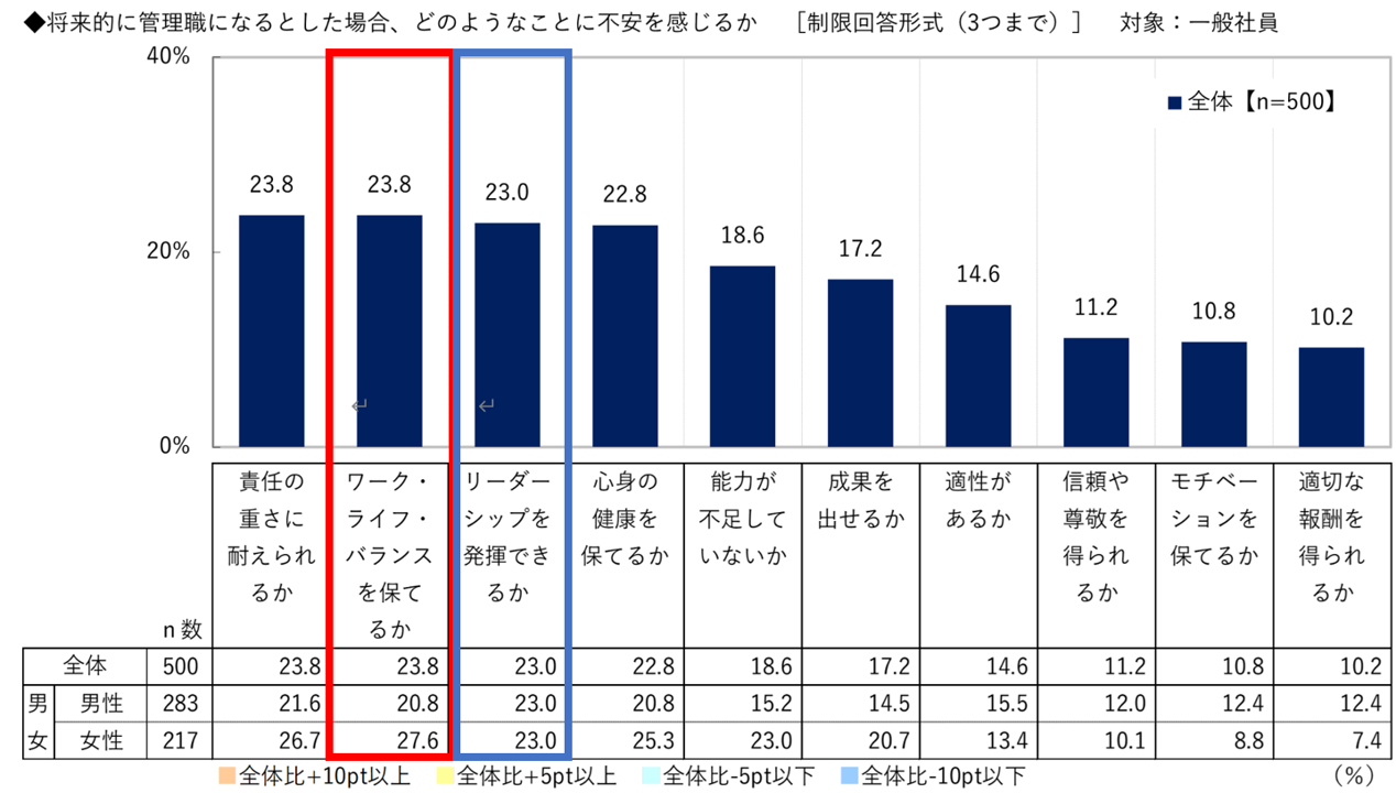 ・管理職になるとした場合の不安要素 同率1位は「ワーク・ライフ・バランスを保てるか」、続いて不安要素 2位は「リーダーシップを発揮できるか」、3位は「心身の健康を保てるか」であった