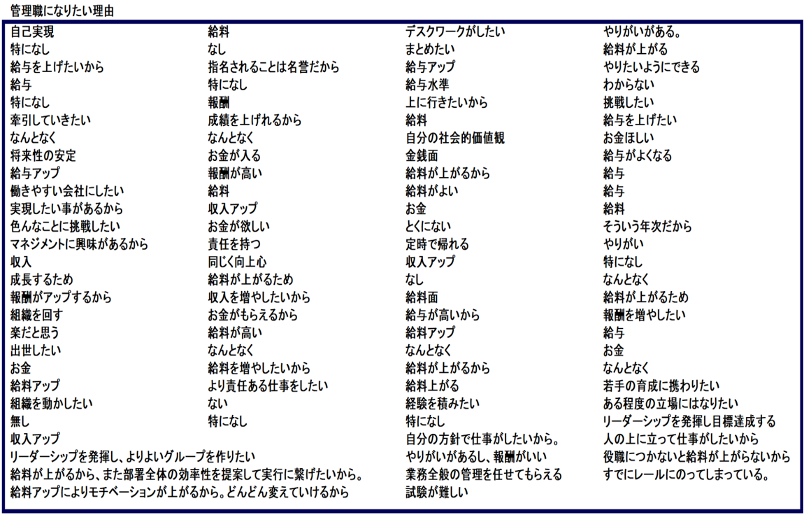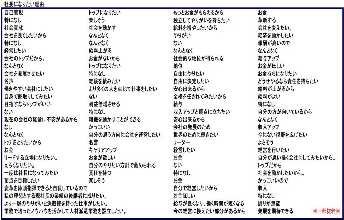 「社長になりたい」理由には、やりがいや社会貢献を連想させるワードが多く見受けられ、「管理職になりたい」理由とは異なる結果となりました。