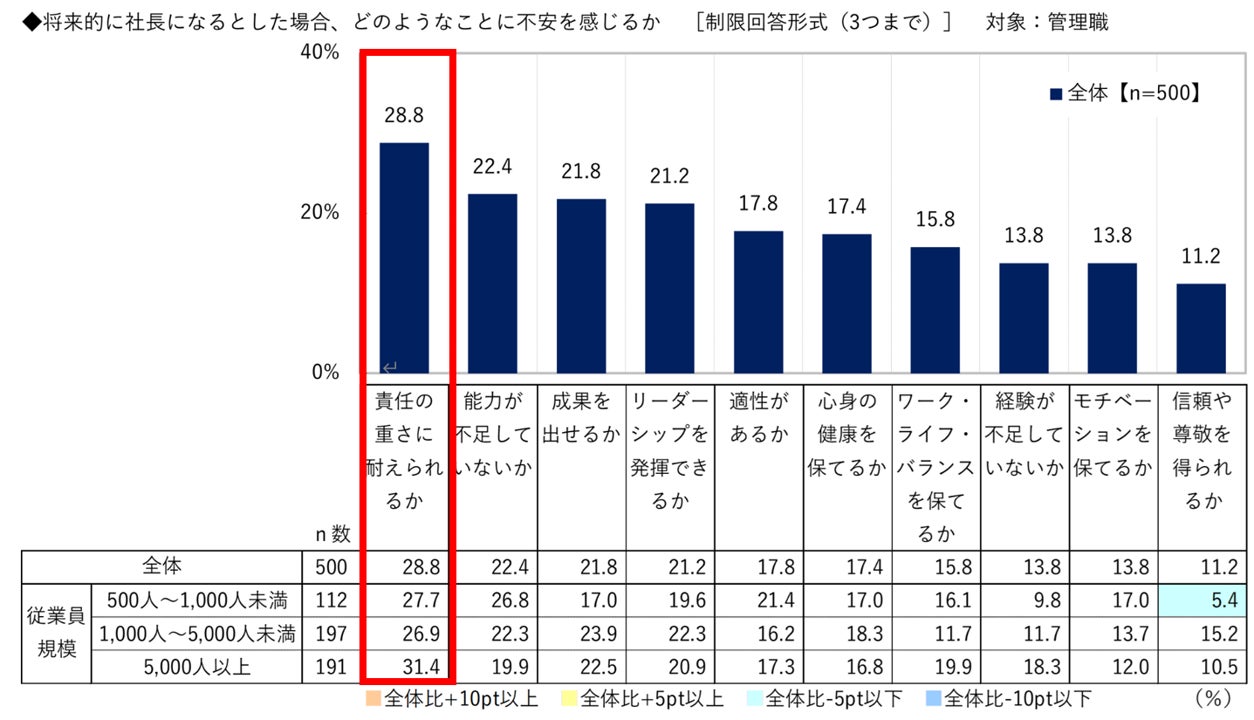 ・特に従業員規模5,000人以上になると、社長になるとした場合の不安要素はダントツで「責任の重さに耐えられるか」が大きく、規模が大きい故の不安(大多数の社員の生活保障、社会に対する責任等)からくることが想定される