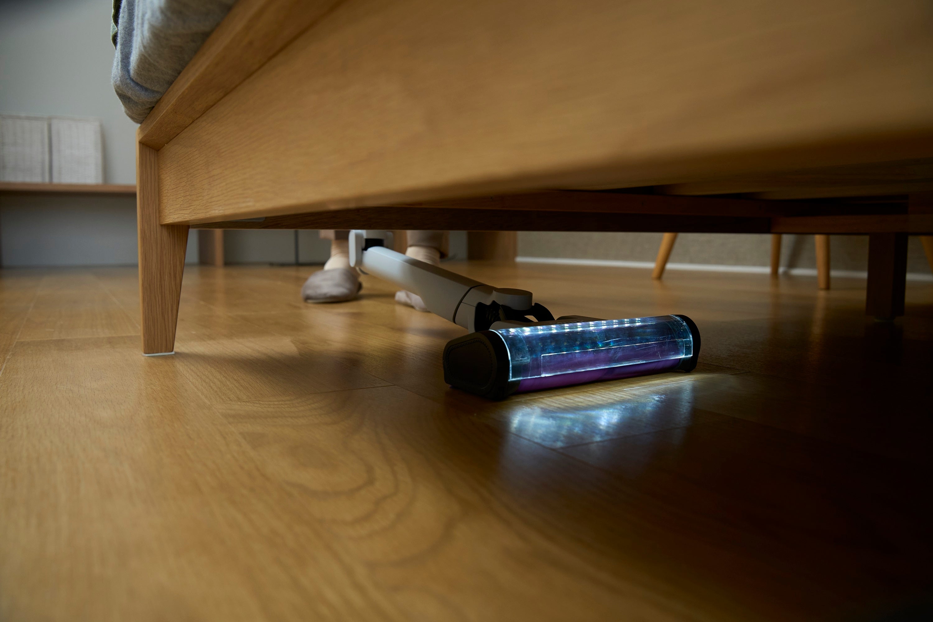 ボタンひとつでパイプが曲がるFLEX(フレックス)機能を搭載しています。かがまず立ったままの姿勢で家具の下をスムーズにお掃除できます。家具前に十分なスペースがなくても、パイプが曲がるためしっかり奥まで入り込みます。ソファやベッド、テーブルや椅子といった脚付き家具の下のお掃除が一段と楽になります。