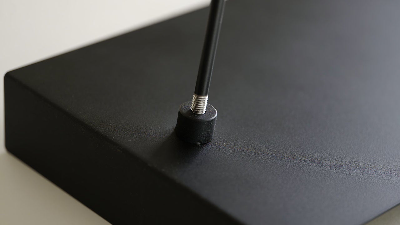 1本の棒で支えるというミニマルな設計で、ねじ込み量の調整で角度の微調整が可能です。