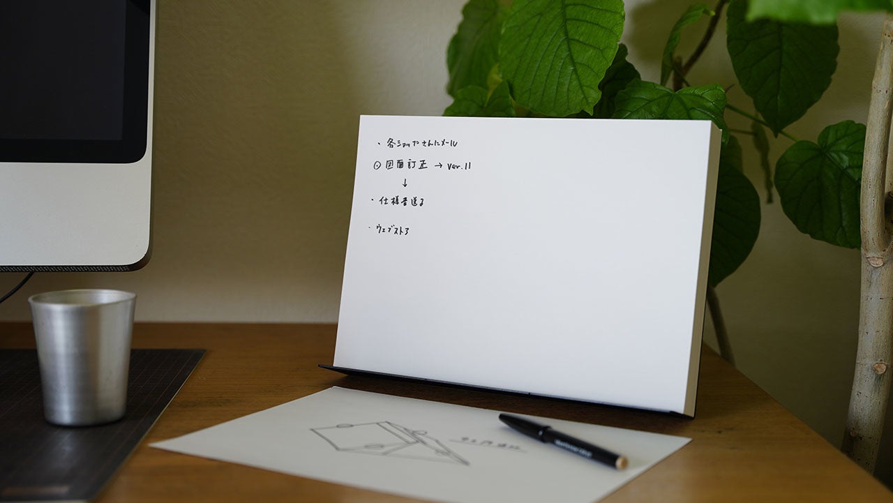 紙だけでなく、ペンも置いておくことができるため、思いついたアイデアをすぐに描きとめられます。