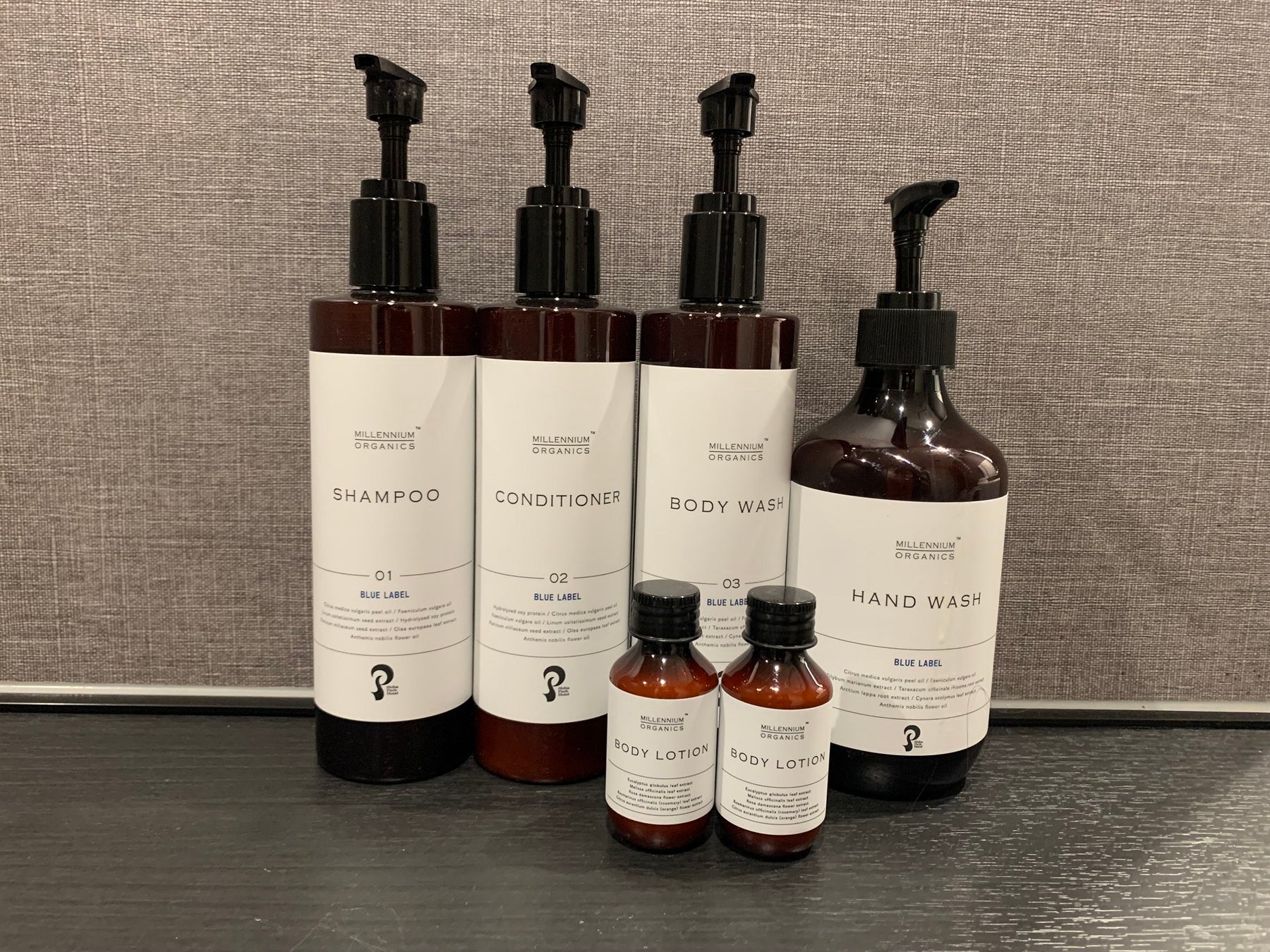 リニューアル後の客室では、持続可能な社会を目指して環境に配慮したアメニティ等を取り揃えました。例えば、ヘアケア・ボディケアで採用した「ミレニアムオーガニックス ブルーレーベル」の製品は植物・ミネラル由来成分90%以上配合で合成香料を使用していないため環境負担が低く、また歯ブラシやヘアブラシは天然の藁を配合したプラスチック使用量を約40%削減できる製品を採用しました。また、客室用ミネラルウォーターは紙パック容器のミネラルウォーター (ハバリーズ社製)を採用しました。