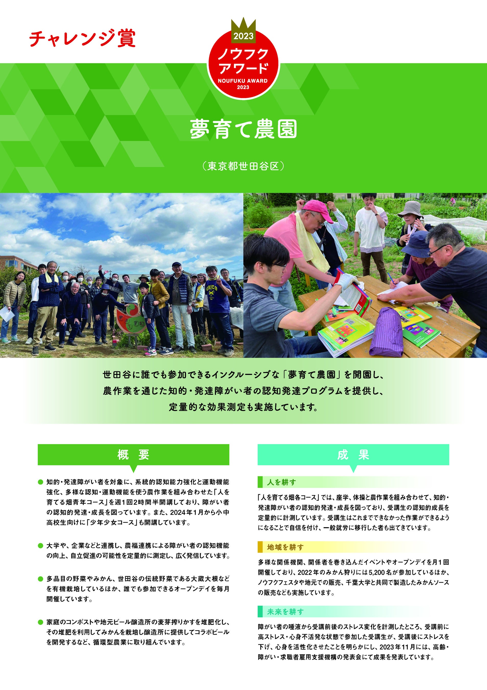 (株)夢育ては、知的・発達障がい者が、その認知発達の遅れにより、社会参加が制限されていることにチャレンジしています。知的・発達障がい者むけに開発したコインケース、ニコニコインはGoodDesign賞2023を受賞し、夢育て農園はノウフクアワード2023チャレンジ賞を受賞しました。これらの活動の背景には、イスラエルの教育心理学者フォイヤーシュタイン教授の考え方が使われており、この度、このフォイヤーシュタイン協会の公認トレーニングセンターとなることで、知的・発達障がい者の認知発達に対する希望を、我が国に広めていきます。
