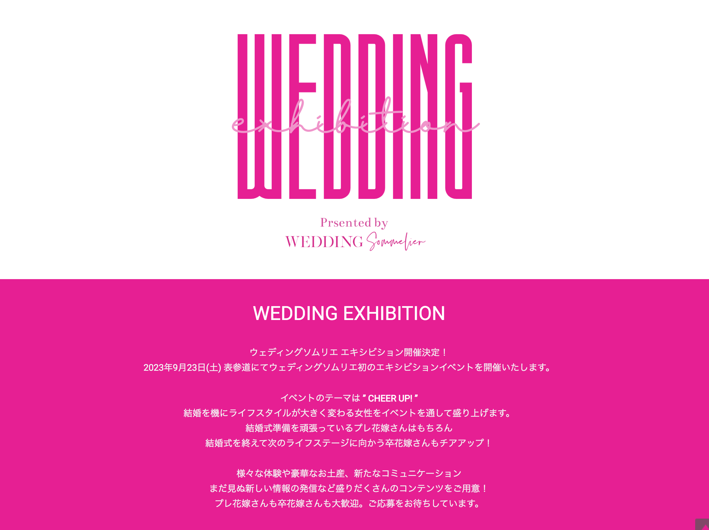 人生でその時しかできない特別な体験を提供するメディアとして、感度の高い花嫁から絶大な支持を集めている花嫁コミュニティ「ウェディングソムリエ」(運営:J’adore Wedding株式会社 所在地:東京港区、代表取締役:坂井夏子)が、2023年9月23日(土)表参道にて、初となるエキシビションイベント『ウェディングエキシビション by ウェディングソムリエ』を開催いたします。