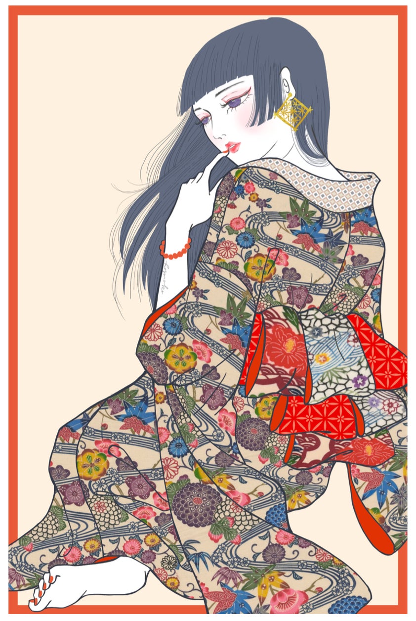 レトロモダンとリアルファッションを掛け合わせた独自の世界観で女性の美しさを描いています。デジタルイラストに留まらず布やアクセサリーを足した半立体作品でより一層奥深い表現力で世界観を創り出しています。