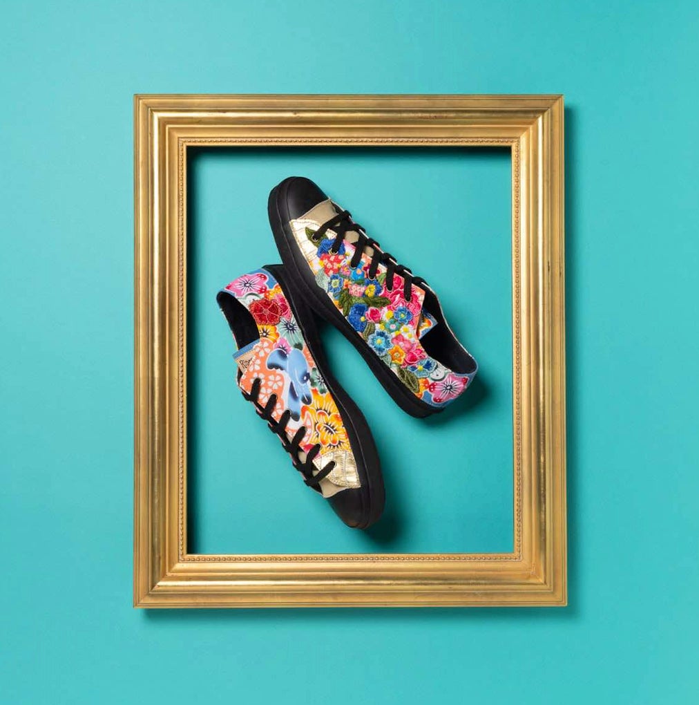 本作品はフランス語で「野生の花」を意味します。沖縄で色鮮やかに咲き誇る花々をイメージして制作しました。心華やぐカラフルな色彩の刺繍とフラワー刺繍アップリケを優美にミックスすることで、洗練された雰囲気を綴った一足に仕上がっています。