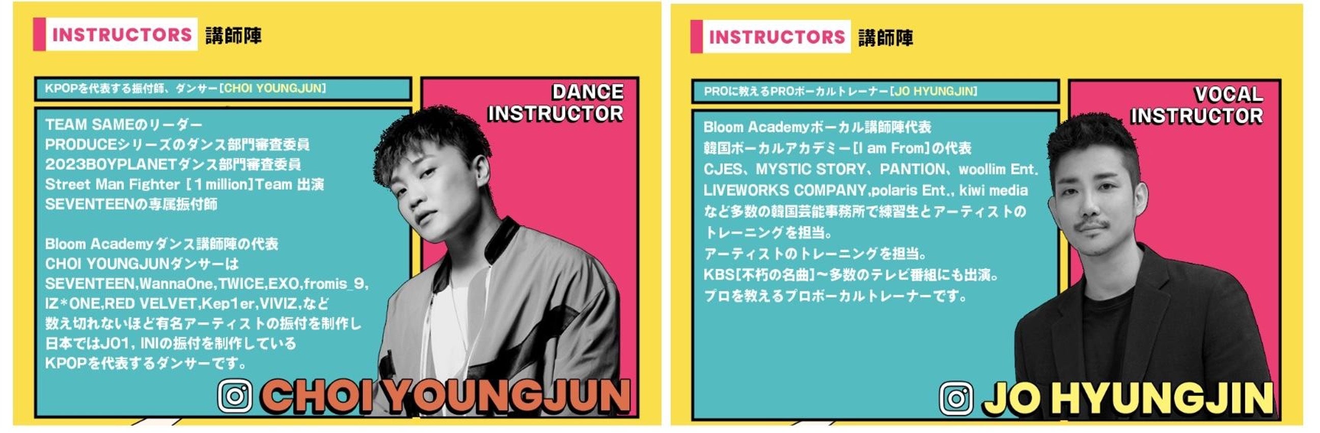 KPOPを代表するTEAM SAMEのリーダーチェ・ヨンジュン氏、韓国のボーカルアカデミー「I’m From」の代表を務めるチョ・ヒョンジン氏を始め、現「aespa」振付師兼トレーナーなど、本場の超一流講師陣が実際にトレーニングを行います。