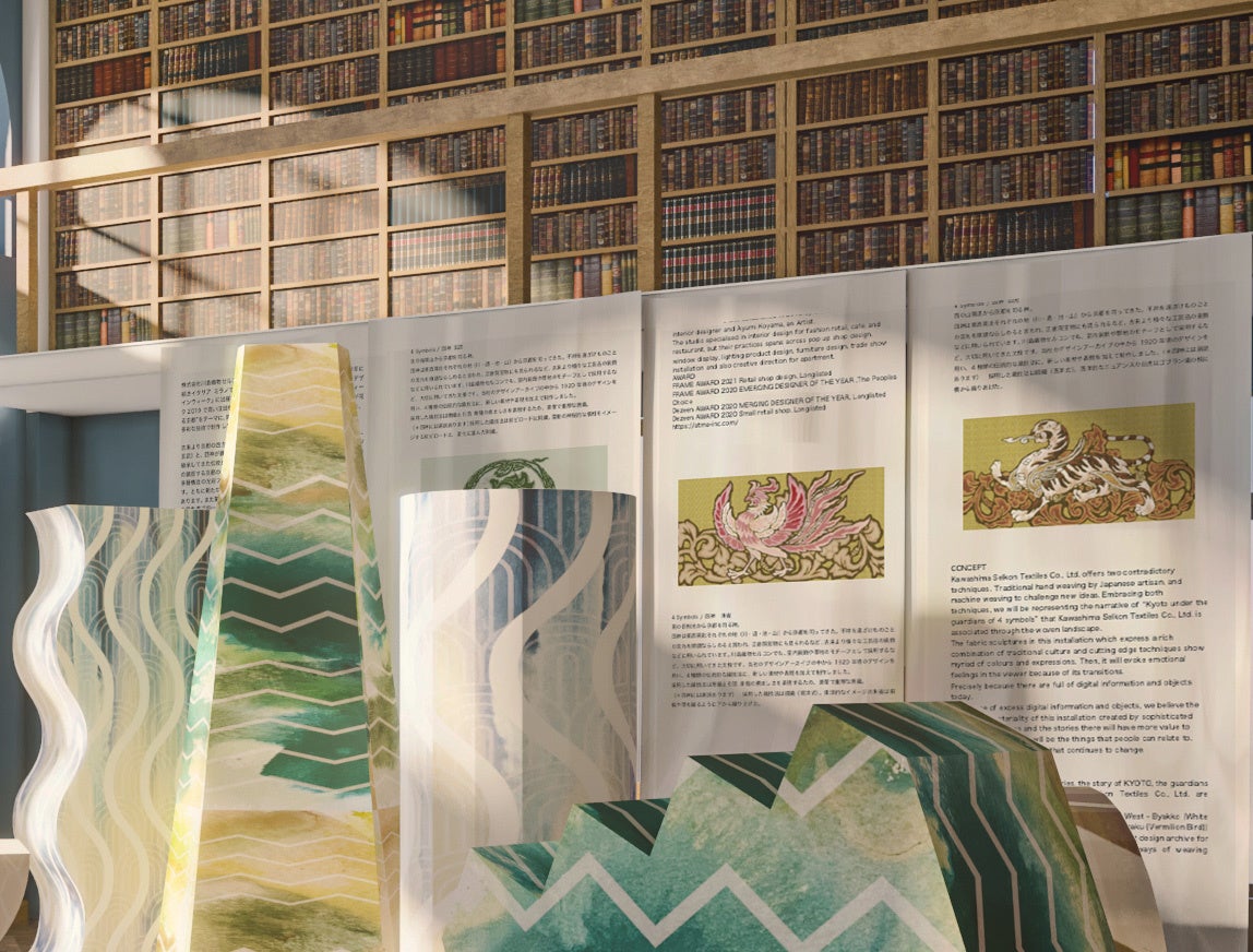 川島織物セルコン発祥の地 京都は、1000余年有為転変の物語を紡いできました。その京都において、不祥を遠ざけものごとの流れを順調ならしめると言われ、古来より東西南北それぞれの地 ( 川・道・池・山 ) から守ってきたとされる神話上の霊獣 四神 ( 東:青龍、西:白虎、南:朱雀、北:玄武 ) 。本展は、ミラノで古くから親しまれ、さまざまな物語が詰まった図書館を舞台に、新たに発表する8種の織物を家具に模したオブジェやタペストリーで展示し、移ろいながらも長きに渡って続いてきた京都の景色と、「四神」が守護する京都が紡いできた物語を多彩で表情豊かなインスタレーションで表現します。