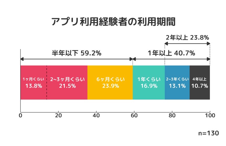 また、「2年以上」で絞り込んでみたところ23.8%と、約4人に1人が長期的に「マッチングアプリ」を利用していたと回答しており、その半数近くが「4年以上」の利用者となります。
