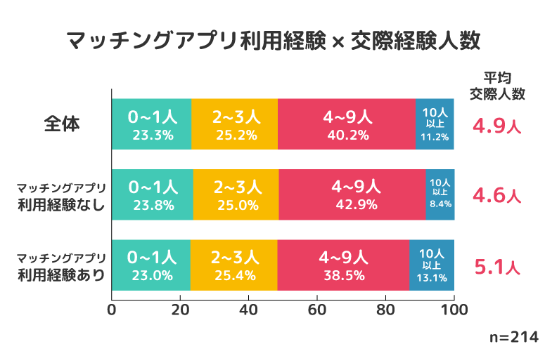 結果としては、「マッチングアプリ・非利用者」は平均4.6人に対して、「マッチングアプリ・利用者」は平均5.1人となり、交際人数に明確な差は見られませんでした。