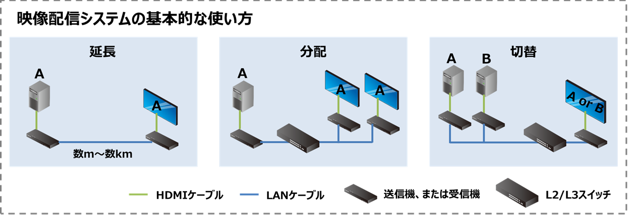 LAN内で安価に延長/分配可能な映像配信システムを構築。 マルチキャスト通信より無制限に複数ディスプレイへ分配表示可能。 専用コントローラで映像切替やビデオウォール構築も簡単。