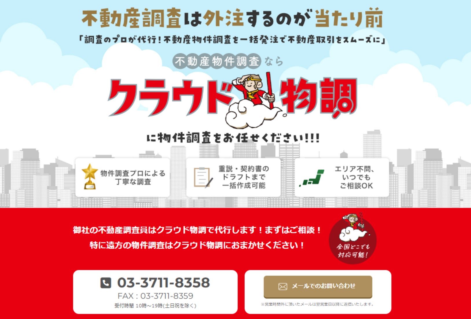 『クラウド物調』は、電話や問合せフォームから不動産物件調査業務を依頼できるサービスです。当社は創業10年、累計1,000件以上を越える不動産物件調査実績があり、提供するレポートは顧客や業界関係者にも高く評価されてきました。当社のノウハウと200名を超えるパートナー調査員を活用し、幅広いエリアや物件種別にわたる不動産物件調査業務を代行します。