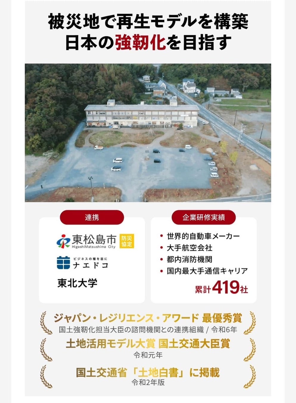 東日本大震災の大津波で廃校になった旧・野蒜(のびる)小学校を利活用し、宿泊もできる体験型防災エデュテイメント施設「KIBOTCHA(キボッチャ)」(2018年にオープン)を運営。