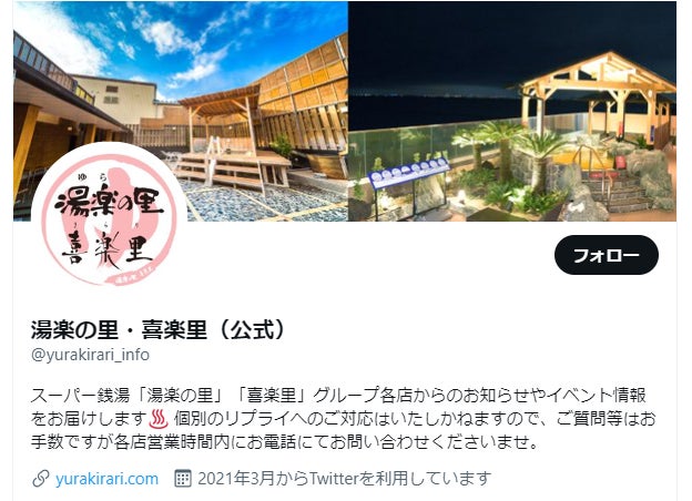 湯楽の里・喜楽里公式Twitter https://twitter.com/yurakirari_info