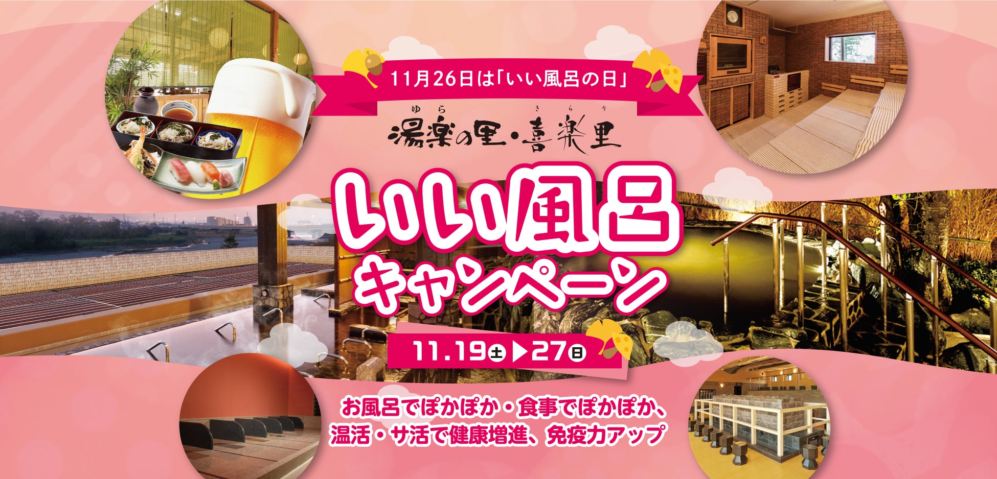 株式会社スパサンフジ(所在地:渋谷区代々木1-35-4 代表取締役社長 末吉 糧)が運営する、日帰り温浴施設「湯楽の里(ゆらのさと)」「喜楽里(きらり)」では、11月26日「いい風呂」の日に合わせて【いい風呂キャンペーン】を開催いたします。
