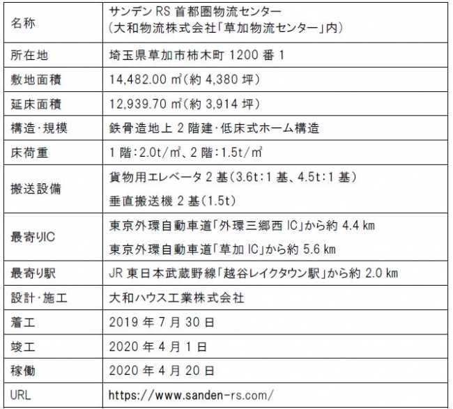 サンデン・リテールシステム株式会社(本社:群馬県伊勢崎市/東京、代表取締役社長:森益哉、以下サンデンRS)は、新物流拠点として、埼玉県草加市に首都圏で最大となる「首都圏物流センター」を竣工し、2020年4月20日受付センター(コールセンター)が稼働を開始、5月7日に全ての施設が営業を開始する予定です。サンデンRSは今回の新物流拠点の設立に伴い、各拠点の機能を集約化することで物流のさらなる効率化を実現します。