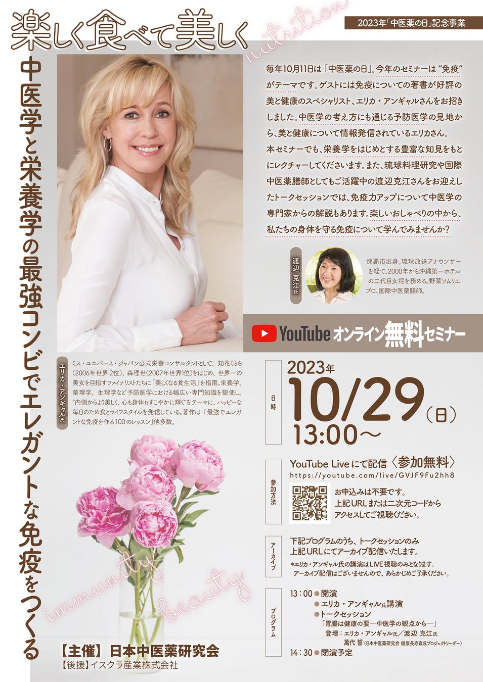 -中医学と栄養学の最強コラボでエレガントな免疫を作る-」を沖縄県那覇市にて開催します。ゲストに栄養コンサルタントであるエリカアンギャルさん、国際中医薬膳師渡辺克江さんをお招きし、楽しく「中医学(中国伝統医学)」が学べる楽しい催しです。なお当日の模様はYouTube Liveにて無料ライブ配信も行います。