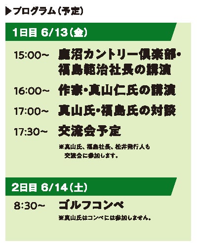 2025年6月13日(金)・14日(土)にはMICE with GOLF第一弾として、小説“ハゲタカ”などの作家・真山仁氏を迎え「日経ビジネス・トップリーダー主催 特別経営講座&ゴルフコンペ」を開催予定。実践事例として、経営者やビジネスパーソンの多数のご参加を予定しています。