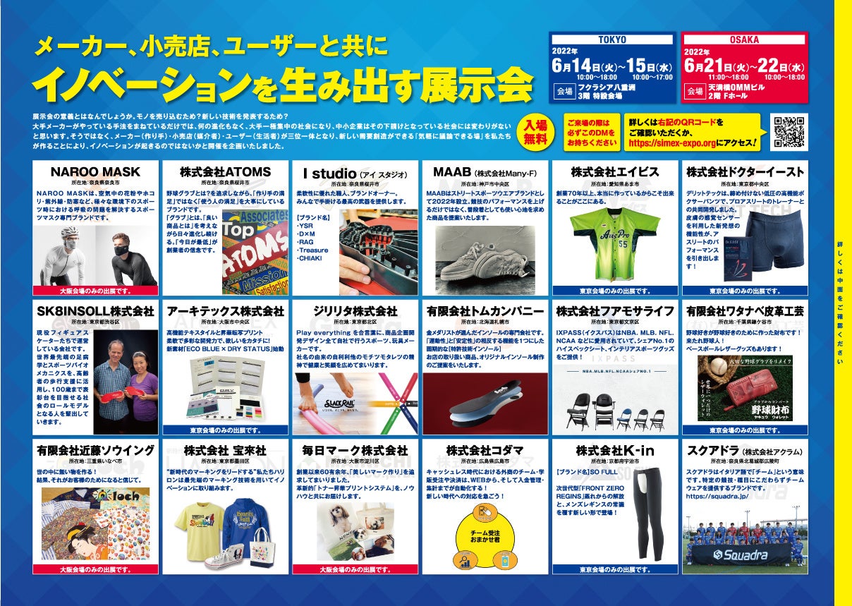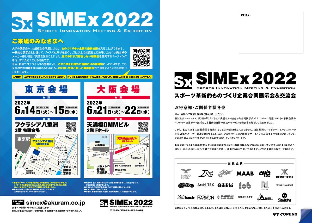全国のスポーツ用品ものづくり中小企業が一同に会する【SIMEx~スポーツ革新的ものづくり中小企業合同展示会&交流会】が、2022.6.14~15に東京フクラシア八重洲特設会場にて、2022.6.21~22に大阪天満橋OMMビル2Fにて開催されます。今回も全国から、ものづくりに自信のある企業18社が合同で展示会を行います。