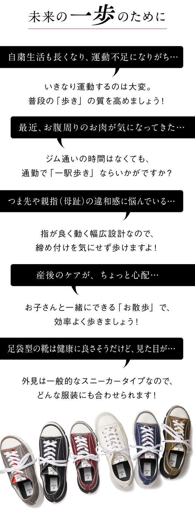 親指と人差し指の間が自然と分かれる雪駄スニーカーなら、指先や足の裏、ふくらはぎといった通常の歩行では使うことの少ない筋肉を使いやすくなり、健康的な歩行に必要な足の「把持力」をトレーニングすることができます。