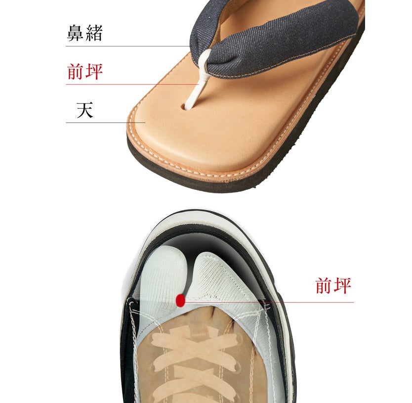 内側のつま先部分に取り付けられた「前坪」によって、履くだけで親指と人差し指が自然と分離。