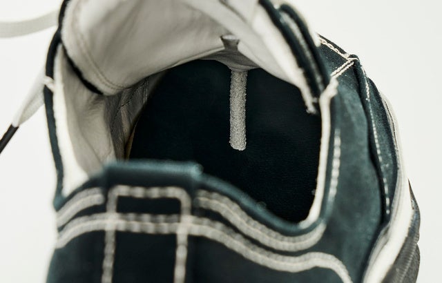 雪駄スニーカーには、弊社の特許出願技術により、雪駄の「前坪」がインソールとアッパーを縦断するように縫い付けてあります。