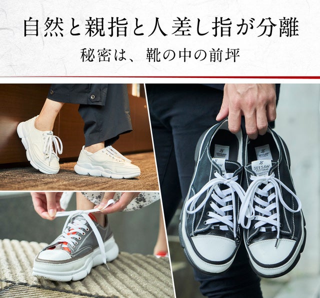 特許出願技術の「前坪」によって、履けば自然と親指と人差し指が分かれる雪駄スニーカーなら、履いて歩くだけで「把持力」をバックアップ。