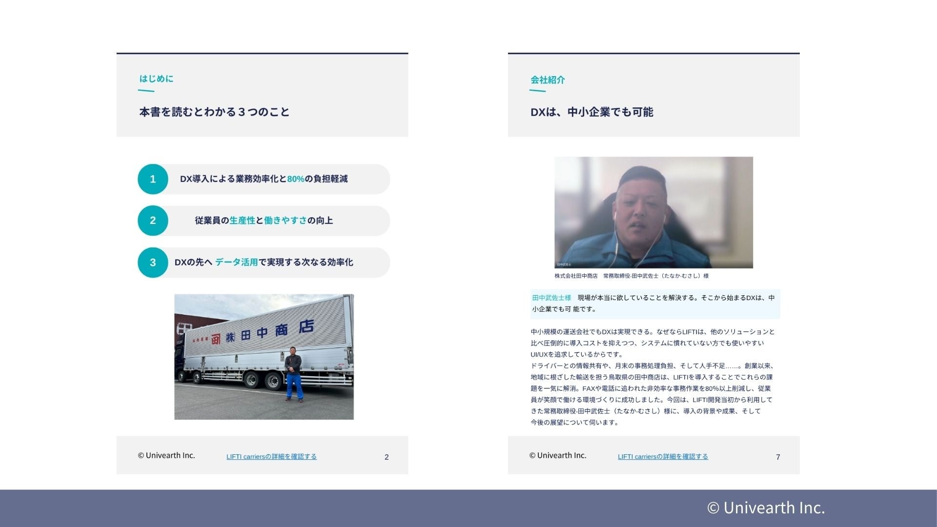 物流DXプラットフォーム『LIFTI』を運営する株式会社Univearth(本社:大阪府大阪市北区、代表取締役:谷口 臨太朗)は、株式会社田中商店(本社:鳥取県東伯郡琴浦町、代表:田中 謙治)におけるLIFTI carriers導入の成功事例をまとめたホワイトペーパーを無料公開いたします。