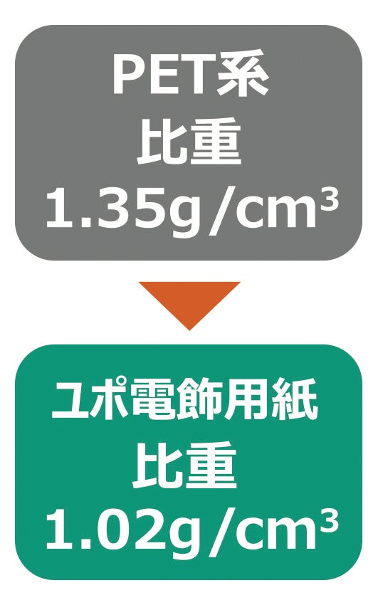 環境面では、両製品ともバイオマス樹脂配合のユポグリーンシリーズであり、更に、ユポ電飾用紙BLRG 150に関しては大判プリント市場で多く用いられている一般的なPET素材のフィルムと比較して比重が軽いため、大幅な「減プラ」と「CO₂排出量削減」が実現できます。