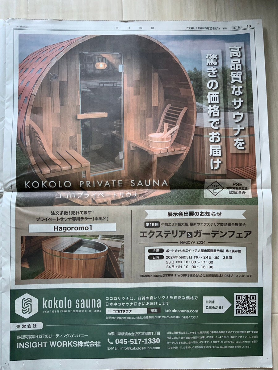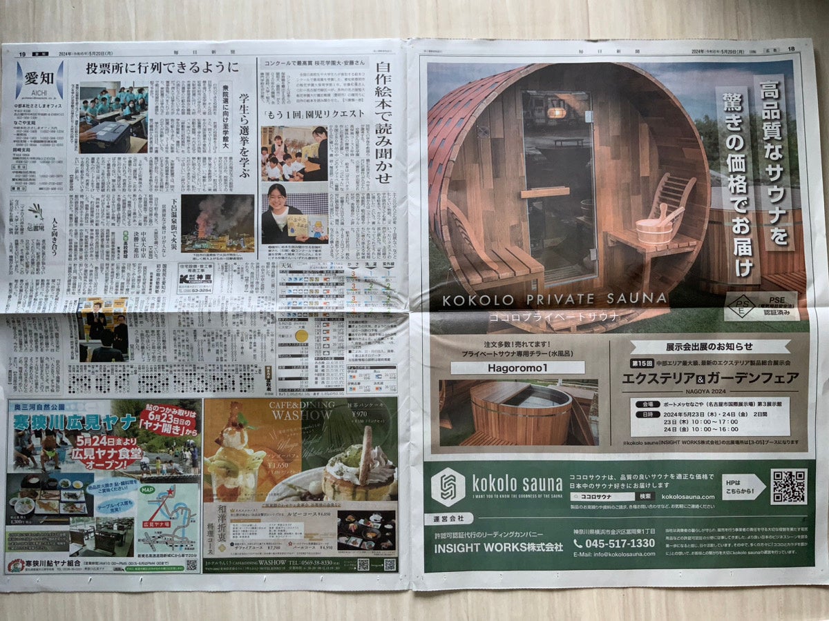 愛知県、岐阜県、三重県で55,000部の発行部数を誇る毎日新聞中部版に「高品質なサウナを驚きの価格でお届け」というコピーで1面広告を掲載。今回の「エクステリア&ガーデンフェア名古屋 2024」への出展をアピールしています。