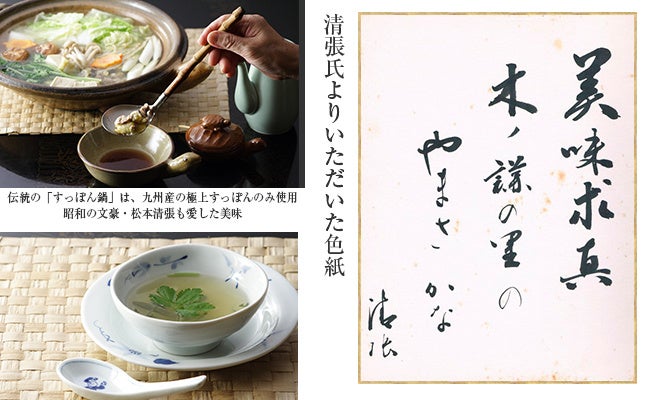当店の安心院すっぽんは滋味深い良質の食材として、晴れの日のお食事や滋養・美容食、長寿を願う贈り物など様々な形で清張氏をはじめ多くの著名人やお客様に愛されております。