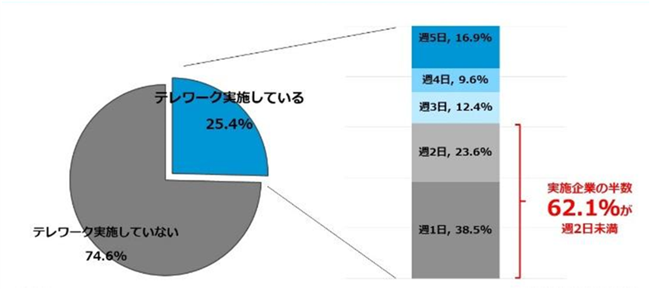 テレワーク実施企業25.4%の実施日の日数内訳を調査したところ、週一日の実施企業は38.5%、週一日は23.6%で双方合わせると62.1%に上り実施企業でも週2日以内が過半数を占めました。企業によっては「週3日、社員の6割以上」を目指している途上との回答もあり、現状3日のハードルは高いことが判明しました。