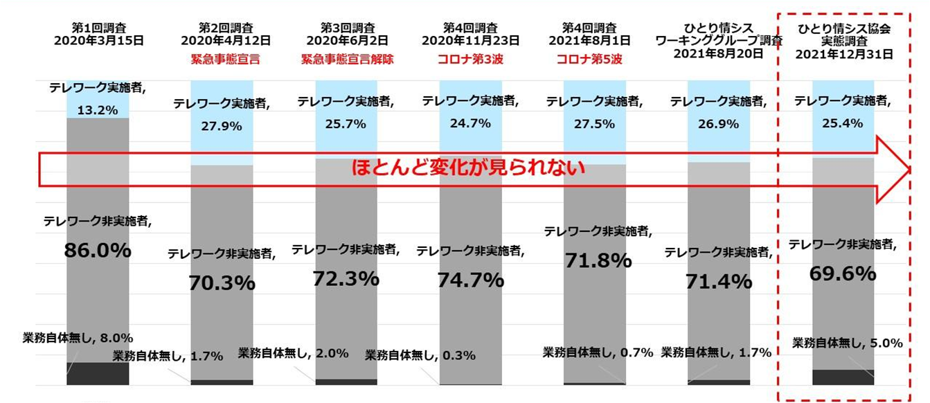 調査は、2021年12月に行われたこともあり、オミクロン株による本格感染が急拡大する第6波前でもあり楽観的な見通しが支配的で実施率は25.4%と低水準なものになっています。また「テレワーク業務自体が無い」と回答した企業が5%とコロナ発生後最高値になり、テレワークへの適用をあきらめた傾向が確認されました。