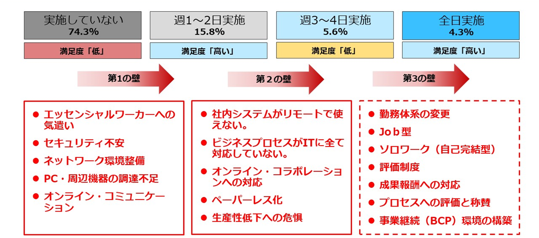 調査によると、中堅中小企業およびひとり情シス企業のテレワーク導入に向けて、三つの壁があることが判明しました。「第一の壁」はテレワーク導入前の障壁、「第二の壁」は週3日以上導入までの障壁、「第三の壁」は全日実施に至るまでの障壁です。それぞれの壁で異なる課題が浮き彫りになりました。