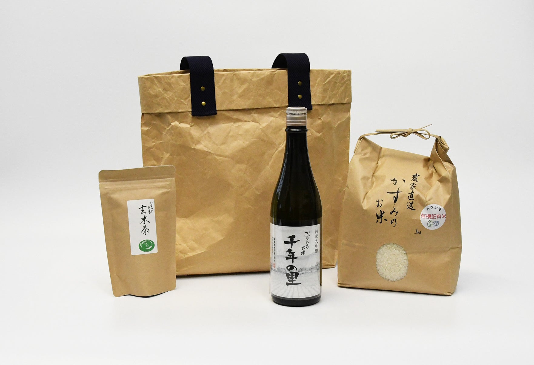 一貫した生産・管理で農家直送の米を届ける米農家。岐阜県の奨励品種で、他県ではあまり出回らない“幻のお米”と呼ばれる「ハツシモ」を使用した商品を開発しました。市内の老舗酒造である御代桜醸造で醸造した純米大吟醸酒は、美濃加茂市が推進する「里山千年構想」から「千年の里」と名付けました。この「千年の里」と、大粒で適度な甘みと程よい粘りが特徴のハツシモそのもの味わいを楽しめる3kgパック、ハツシモで作った玄米茶の3点を、お米の袋をリサイクルしたバッグに入れた詰め合わせセットもご用意しました。