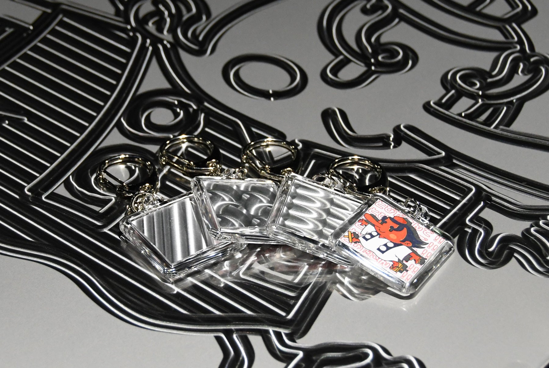 独自の技術でデザイン研磨を施し、金属に新たな価値を与える研磨技術会社。市の観光名所で交通安全のご祈祷も行われる「古井の天狗山」の天狗をモチーフにした、交通安全に寄与できるような商品を開発しました。キュートな天狗のイラストが車のライトを反射して事故を防止する看板と、片面には天狗のイラスト、もう片面にはリフレクターをあしらったキーホルダーは、50年以上の歴史で培ってきた金属板や樹脂板へのデザイン研磨の技術を、地域のために活かしたいという思いから生まれた商品です。
