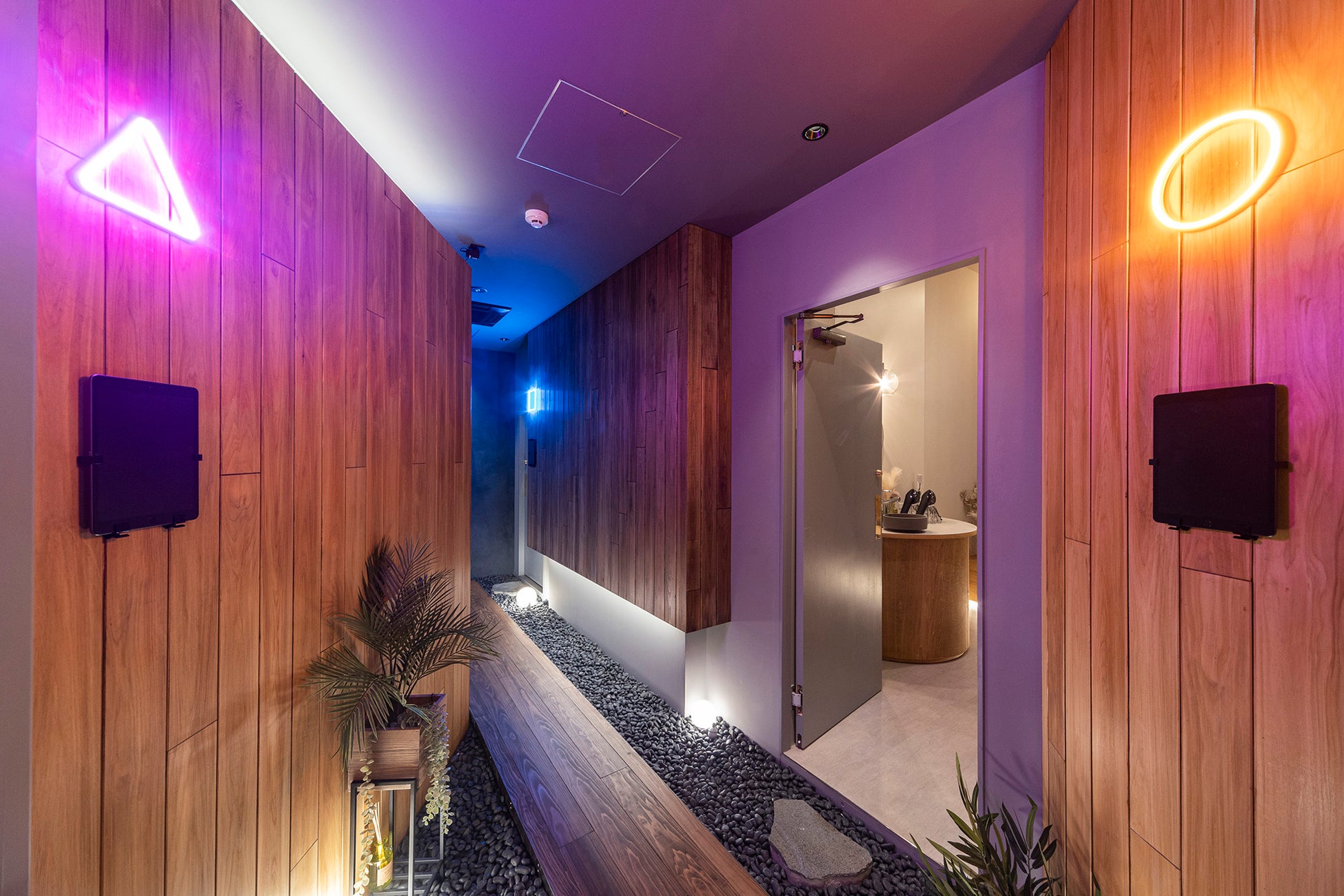 サウナ→水風呂→休憩までの効率的な動線設計に加え、コミュニケーションサウナのコンセプトの通りに、自然とコミュニケーションが生まれる様な空間設計がデザインの特徴となっていることに加え、光や香り、音響などにもこだわり、様々な感覚で味わう没入型サウナ体験を提供します。