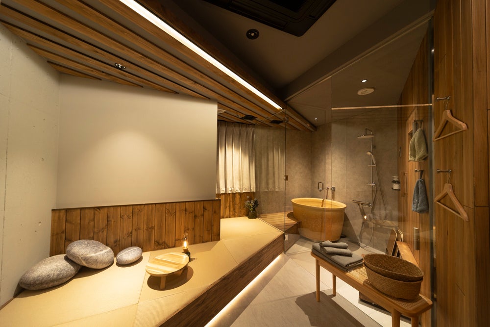 休憩スペースには広々とした畳スペースと、インフィニティチェアを2脚配置し、複数名でもゆったりとご利用いただけるシーンを想定。水風呂は水深にもこだわった、最大2名でもご利用可能な浴槽を配置。落ち着いた大人の雰囲気の中、サウナミーティングなどのビジネスシーンでも利用可能。
