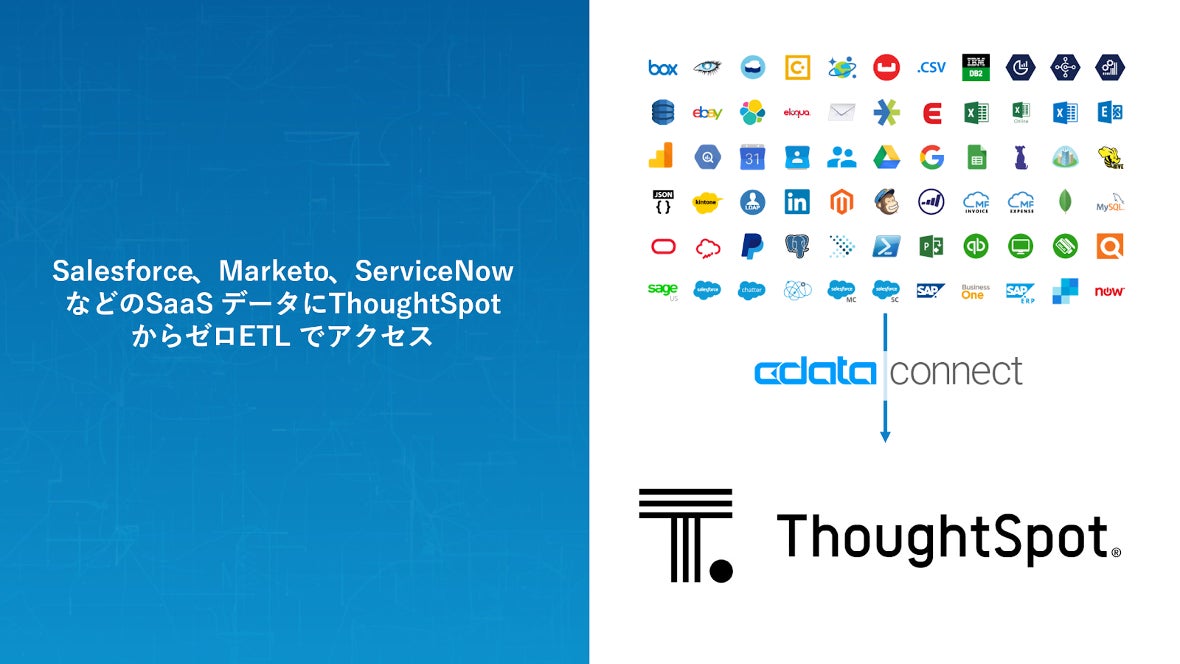 2024年7月29日、ソートスポット合同会社(本社:東京都千代田区、以下ThoughtSpot)はCData Software Japan 合同会社(本社:アメリカノースカロライナ州、日本オフィス:宮城県仙台市、代表社員 職務執行者:疋田 圭介、以下CData)のクラウドデータ仮想化の『CData Connect Cloud』とThoughtSpotが提供するAIを活用した分析プラットフォーム『ThoughtSpot』の製品連携を発表しました。これにより、ThoughtSpot からSalesforce、Marketo、ServiceNowをはじめとする175種類以上のSaaS データへのゼロETL での連携が可能になります。