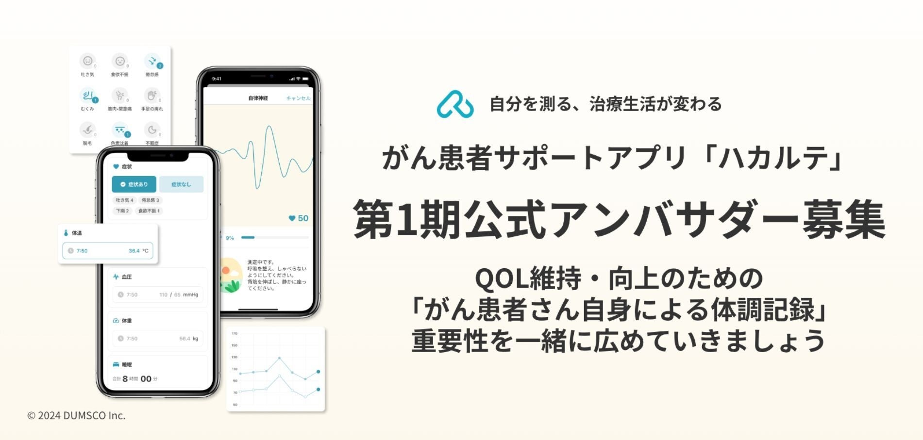 株式会社DUMSCO(所在地:東京都港区、代表取締役CEO 西池成資、以下 当社)は、がん治療における体調記録の大切さやがん患者のQOL維持管理の重要性などついての啓発を目的に、がん患者の治療生活を変えるがん患者サポートアプリ「ハカルテ」の「第1期ハカルテ公式アンバサダー」募集を開始いたしました。