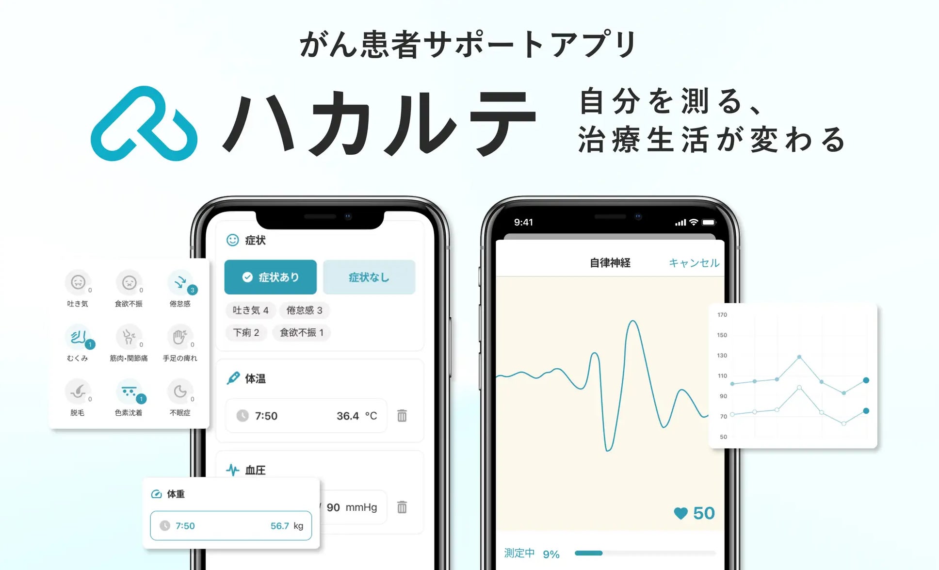 「ハカルテ」はスマホで簡単に体調を測定・記録でき、がん患者が医療者に心身の状態を伝える手助けをするアプリです。がん患者が自分の状態を知り、より主体的に治療やケアを受けられるようサポートすることで、がん患者の自己効力感を高め、QOL(生活の質)向上に寄与します。