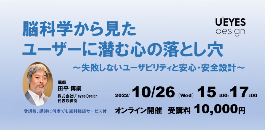 デザインコンサルティングを行う株式会社U'eyes Design(神奈川県横浜市、代表取締役・田平 博嗣、以下当社)は、有料のオンラインセミナー「脳科学から見たユーザーに潜む心の落とし穴 ~失敗しないユーザビリティと安心・安全設計~」を、2022年10月26日(水)に開催いたします。