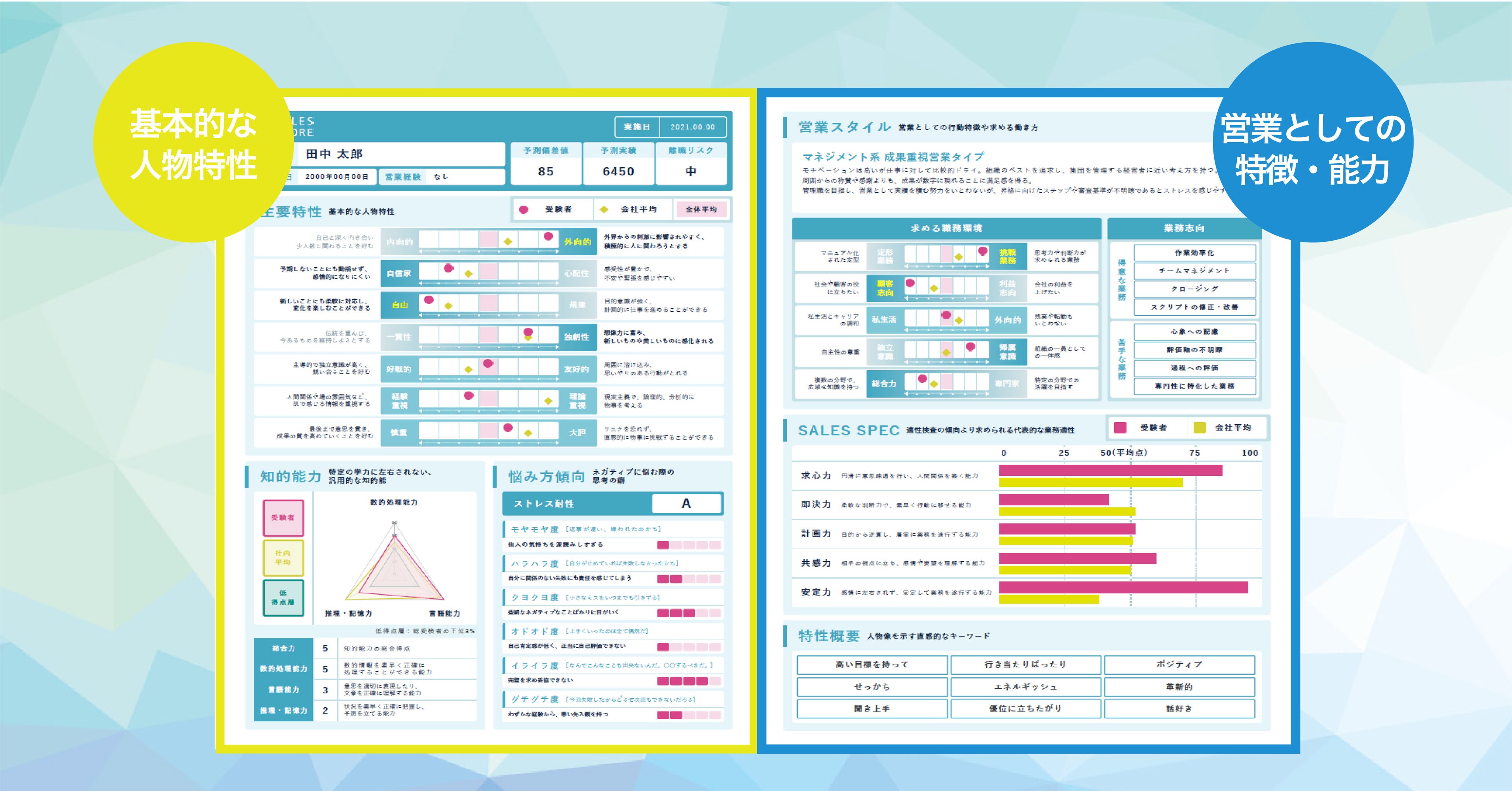 検査結果は左右に分かれており、左側では受検者の人物像がひと目で分かる基本的な特性が、右側では受検者が営業職として業務を行った際の特徴や能力についてまとめられています。