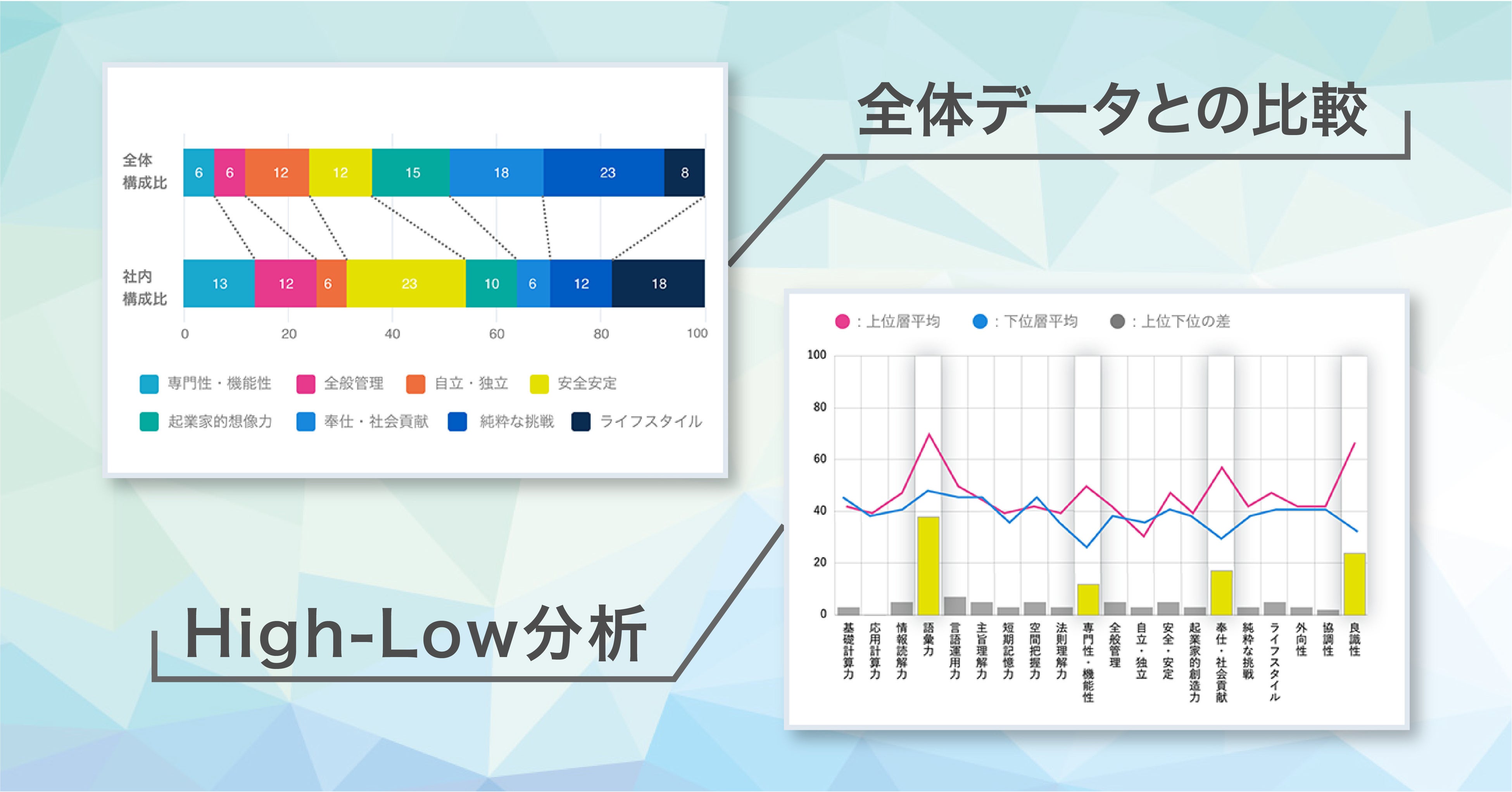 登録された営業実績をもとに従業員を上位層と下位層に分け、それぞれの各種検査項目を比較します。貴社で活躍する人材に共通する特徴が数値で表されます。