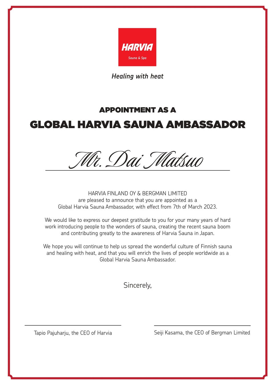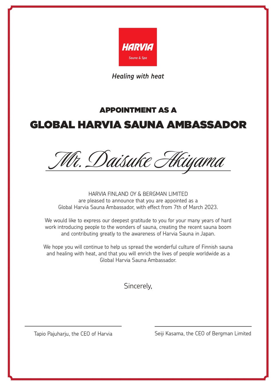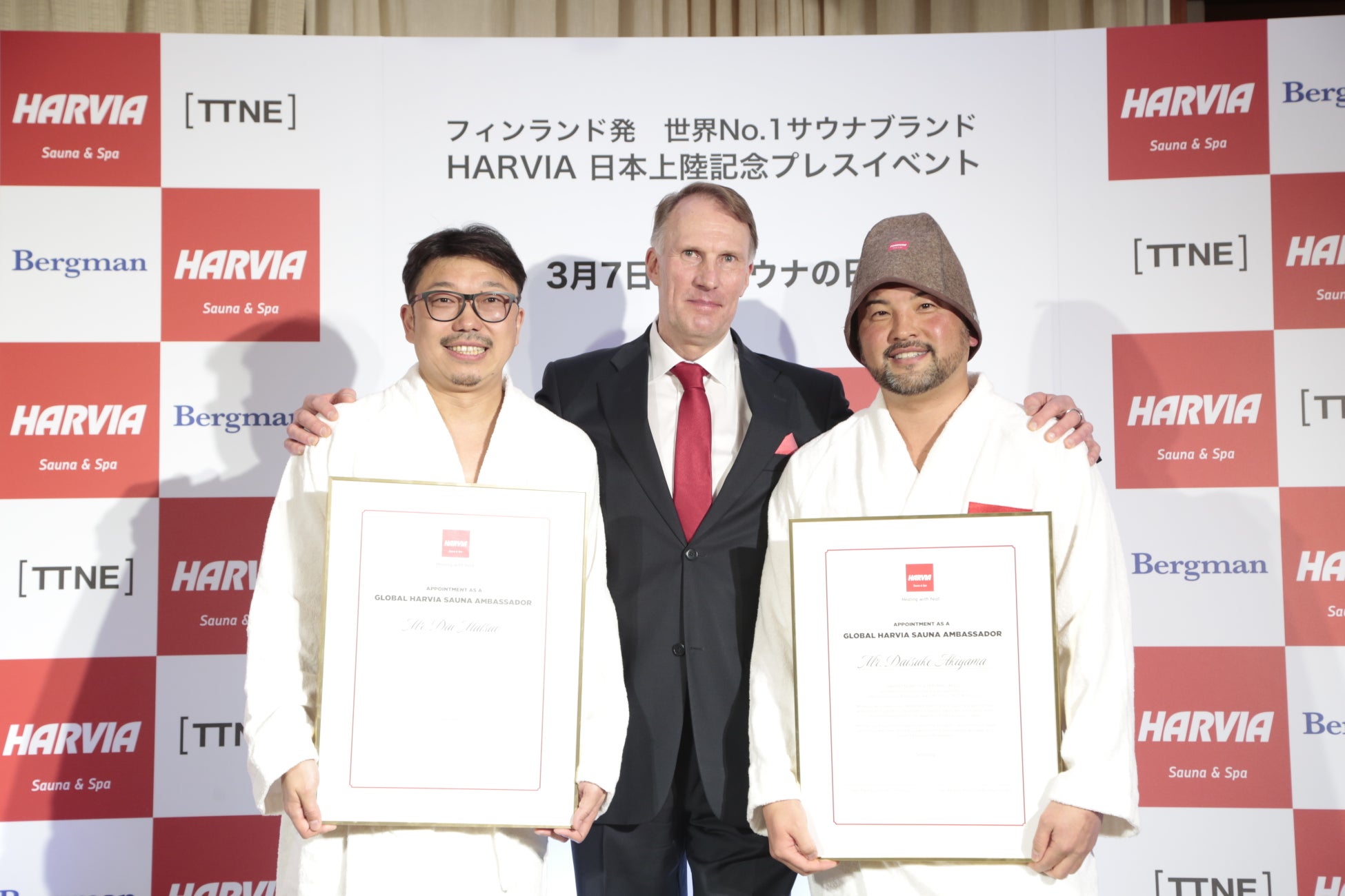 2023年より日本市場に本格的に上陸し、日本人のライフスタイルに併せた日本限定のアイテムを含めた14機種のサウナキャビンと13種類のサウナヒーターの展開を行います。本格上陸に併せてグローバル品質のHarviaが提供するフィンランドサウナの日本での普及や、グローバルに向けた日本発のサウナカルチャーの発信に期待を込めて日本のサウナ界を代表する「ととのえ親方」と「サウナ師匠」がグローバルアンバサダーを務めることになりました。3月7日にはHarvia CEO TAPIO PAJUHARJよりお二人に任命書の授与を行う授与式も実施しました。サウナヒーター、ストーブの市場において世界No.1のシェアを獲得しているハルビア社が、日本からグローバルアンバサダーを起用することは快挙と言えます。