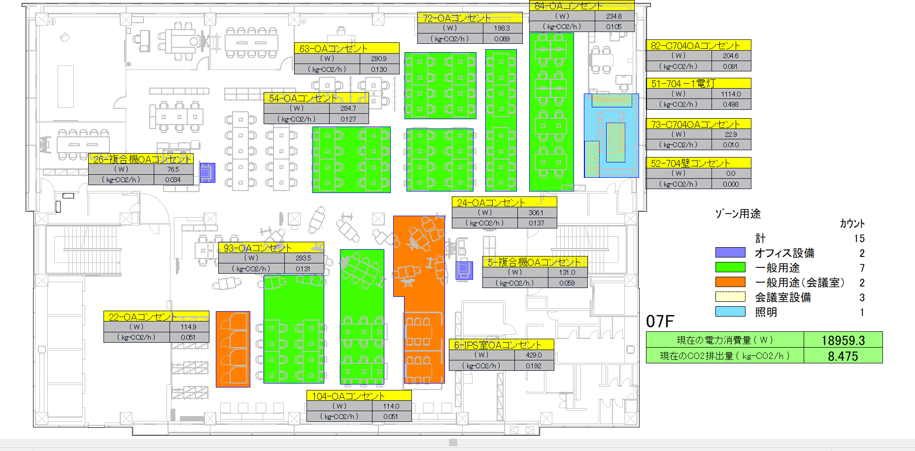収集したデータは、管理システム(※)のフロアマップ上でCO2排出量として換算されディスプレイ表示される