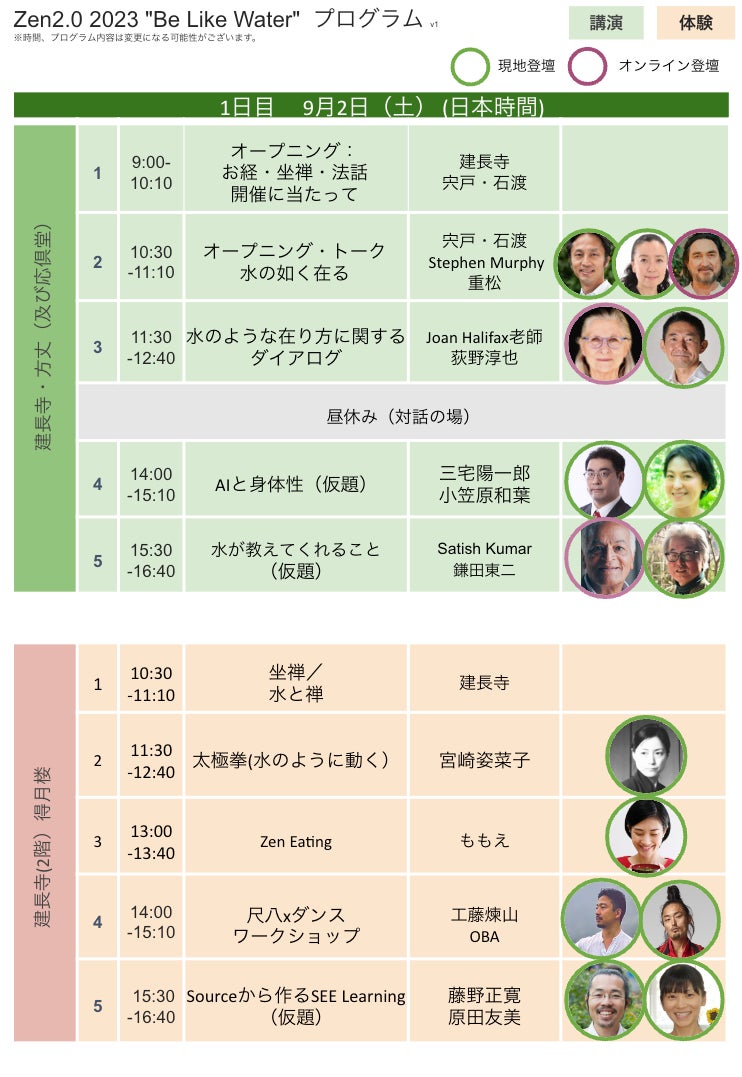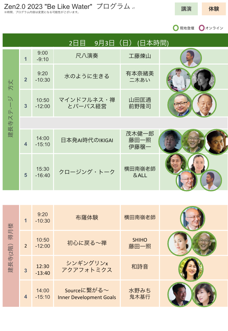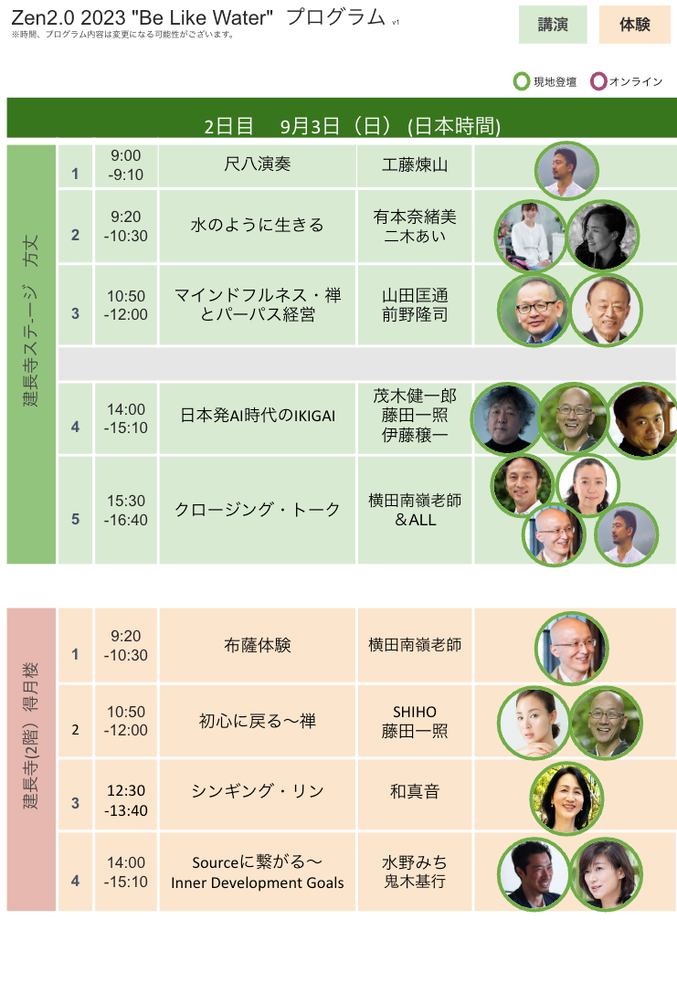 世界のいたる所に顕在化している分断や対立だけでなく、地球温暖化の問題や大手テック企業での大量解雇、AI技術の加速度的な進展など、時代のスピードは加速し、変化の大波が明らかに迫っています。そのような環境下だからこそ、私たち一人ひとりがしっかりと本来の自分を見つめ、大切なコアの価値観(Source)に繋がり、水源から湧き出る泉が川となって流れるように、そこからのエネルギーで自然な流れ(Flow)が創り出され、私たちのコミュニティ・社会・地球の中でそれぞれのパーパスに繋がったアクションに繋がり(Alignment)、広い海へと循環・浸透してゆく。 今年のZen2.0では、その想いを「Be like Water ~Souece, Flow, Alignment~」という言葉に込めました。