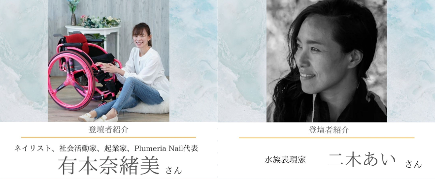希少難病のHAM(脊髄症)となりながら、経験を活かして車椅子女子の就労支援される有本さんと、フリーダイバー・水族表現家(水中写真)として活躍する二木あいさんとの対話を通して、人生や自然のなかでの困難に直面してても、自然体で、たゆやかに「水のように生きる」ていくことの、秘訣を浮かび上がらせます。