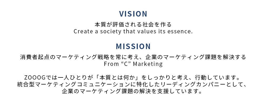 「本質とは何か」を常に考えて行動しているZOOOGが企画力と統合マーケティングで企業様のマーケティングを一気通貫して支援することで「本質が評価される社会」の創造を実現してまいります。